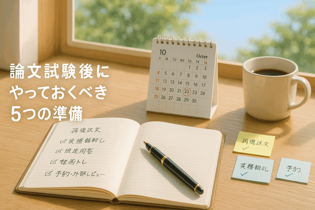 残業・家事・突発対応…時間が読めない社会人でも、毎日15分と週2回30分なら合格線に近づけます。やることはシンプル。通勤で結論→理由→数字→リスクを声出し、帰宅後に3行メモで着地。週2回は再現論文/業務3行メモ/想定質問の録音をローテーション。新しい... 学習法・勉強習慣論文試験後にやっておくべき 5 つの準備|口頭試験にスムーズに移行