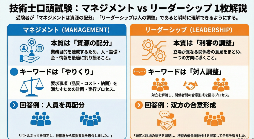 【技術士二次試験】口頭試験で「マネジメント」と「リーダーシップ」の違いを説明できますか?