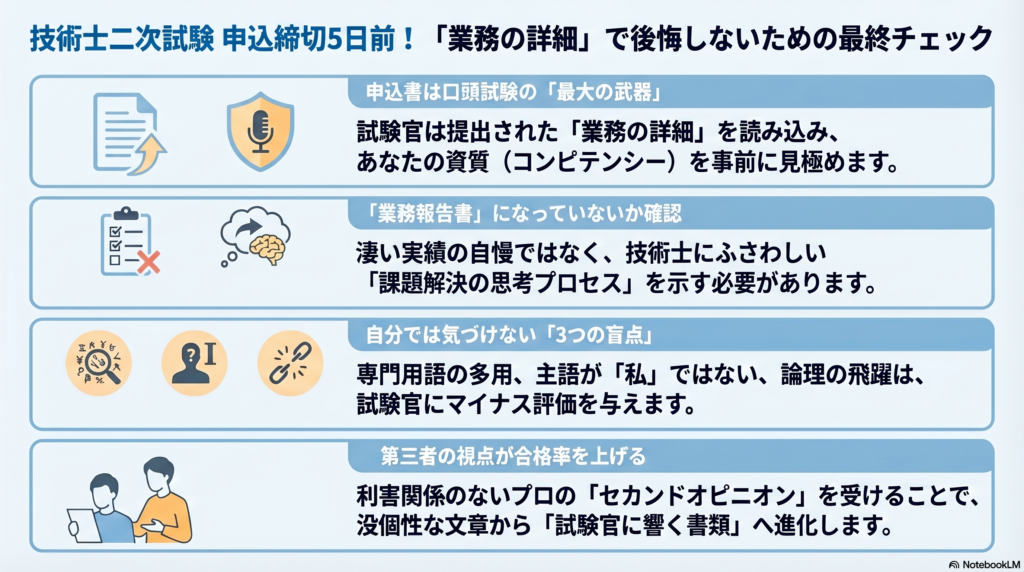 【技術士二次試験】申込締切まで残り5日!「業務の詳細」最終チェックにセカンドオピニオンを活用すべき理由