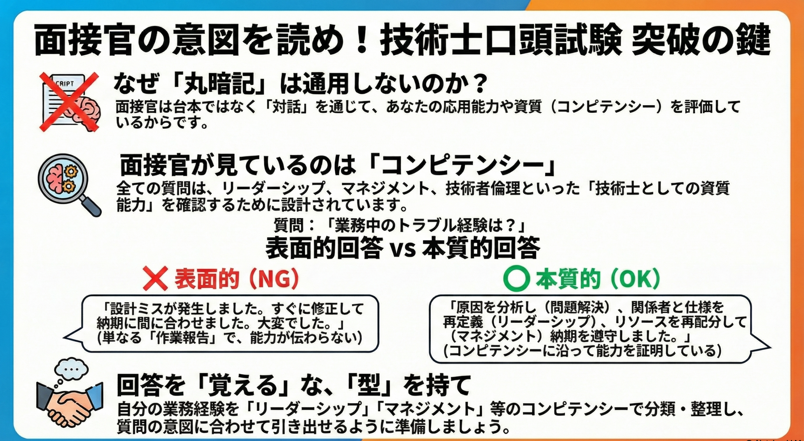 なぜなら、実際の口頭試験は、受験者の「技術的体験を中心とする経歴の内容と応用能力」を評価する場であり、台本の読み合わせではないからです。少し角度を変えられただけで頭が真っ白になり、しどろもどろになってしまう……これが不合格になる典型的なパターンです。