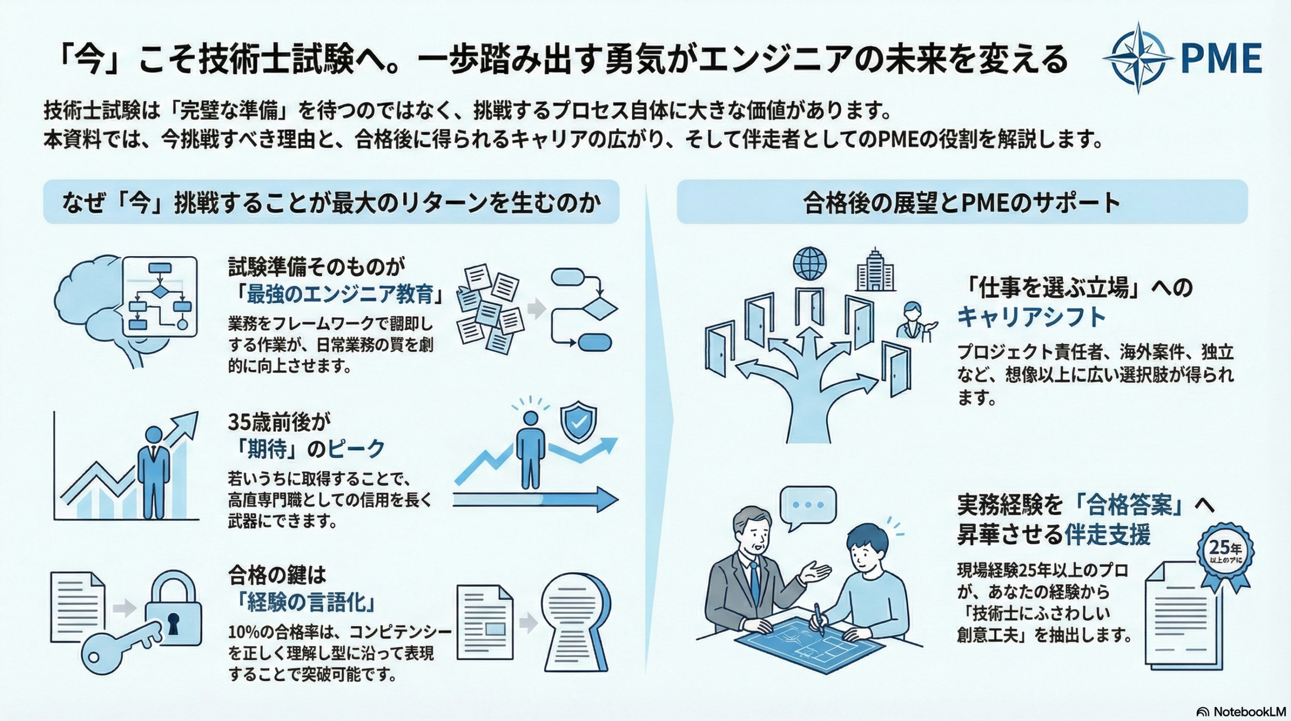 私たちPME(P-Mind Engineer)は、単なる試験対策塾ではありません。現場を25年以上経験してきたプロフェッショナルとして、あなたの実務経験の中に眠る「技術士にふさわしい創意工夫」を一緒に見つけ出し、言語化するパートナーです。