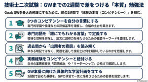 技術士二次試験の合格は、一夜にして成るものではありません。しかし、GW前の2週間を戦略的に活用し、「本質を捉える」学習を実践することで、その道のりは大きく加速します。