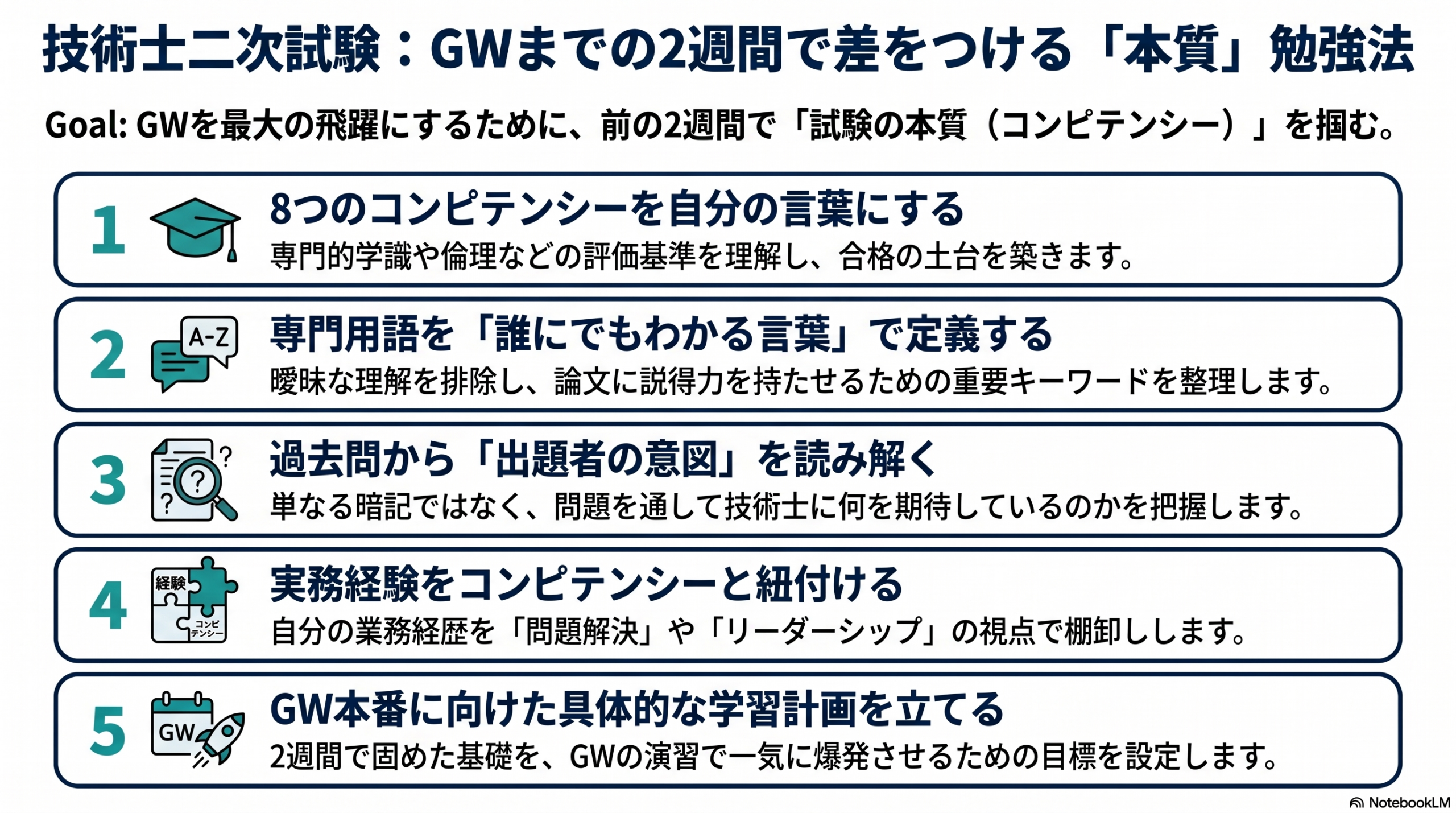 - 目標設定: GW中に「〇〇の過去問を解く」「△△分野の知識を深める」「自身の業務経験を3つ整理する」など、具体的な目標を設定します。