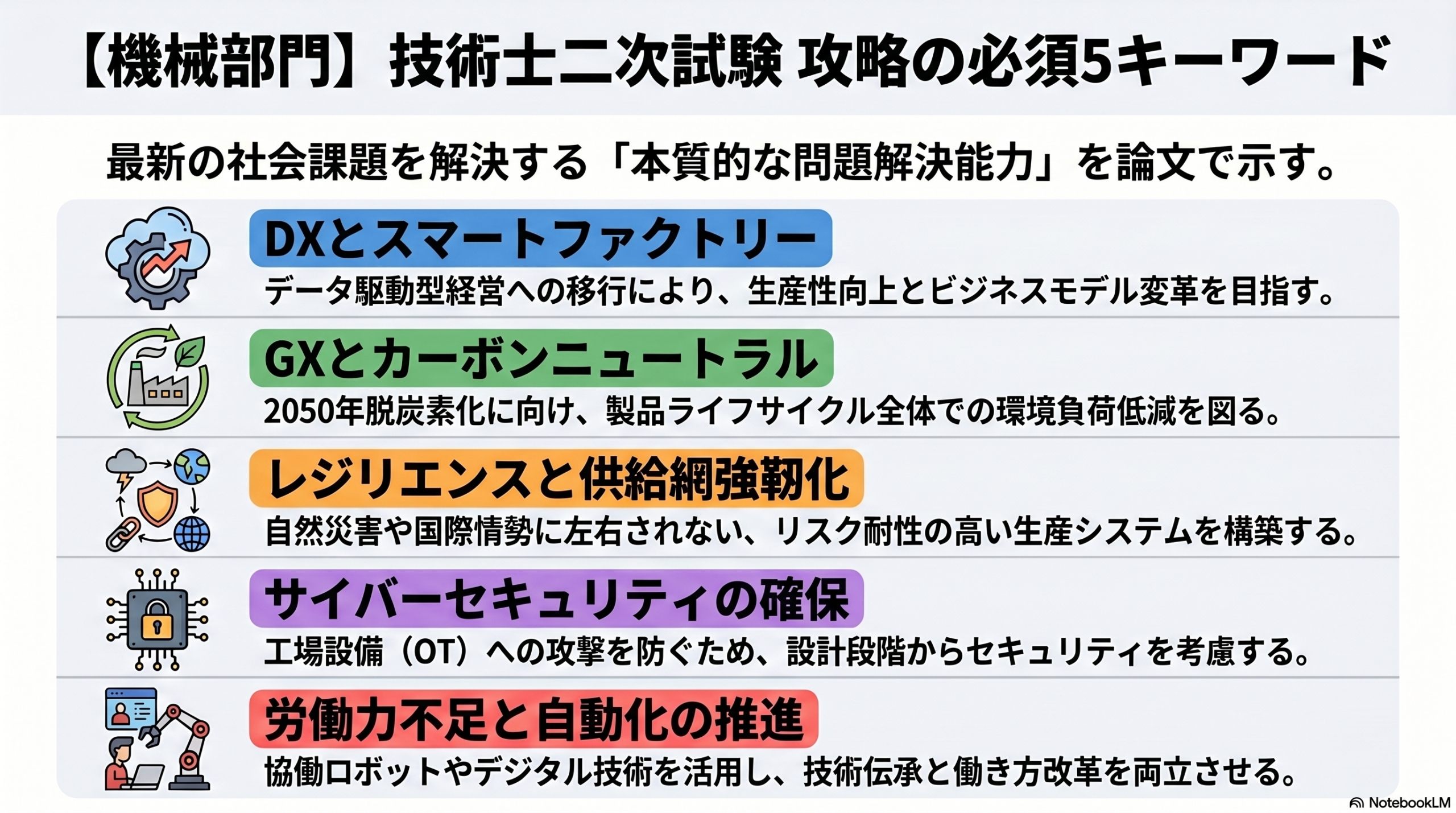 技術士二次試験、特に機械部門では、最新の社会・技術動向を深く理解し、自身の専門性と結びつけて論じる力が求められます。本記事でご紹介した「DX」「GX」「レジリエンス」「サイバーセキュリティ」「人手不足・自動化」といったキーワードは、現代の技術士が向き合うべき重要なテーマです。
